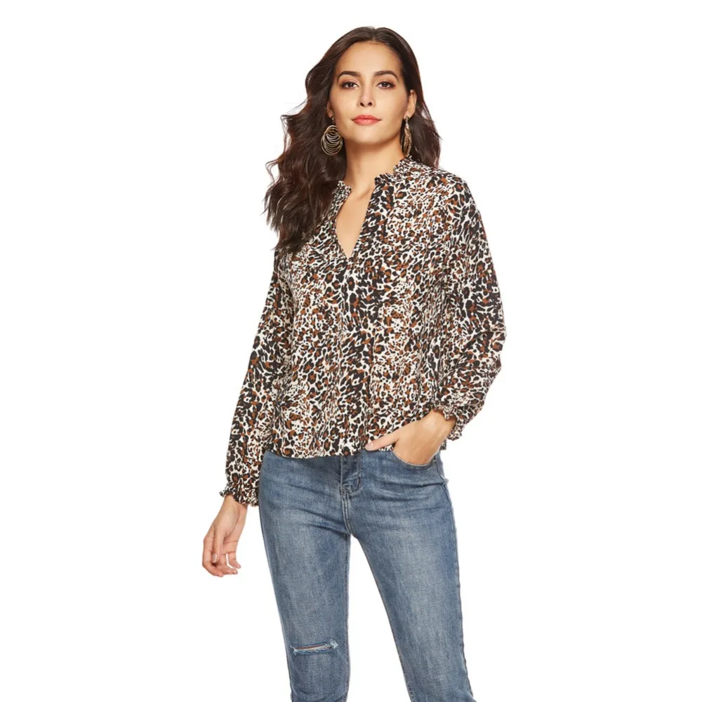 Voucher Automne printemps Sexy léopard femmes Blouses à manches longues femme à volants dame chemise boîte