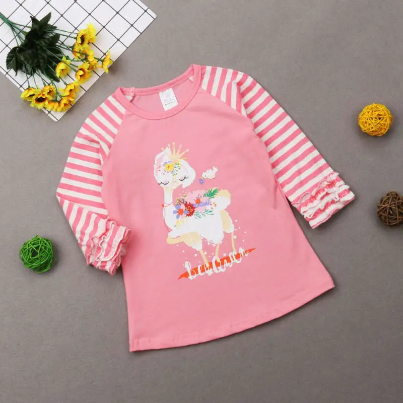 Refurbished T-shirt à manches longues à volants rose col rond en coton fille T-shirts hauts