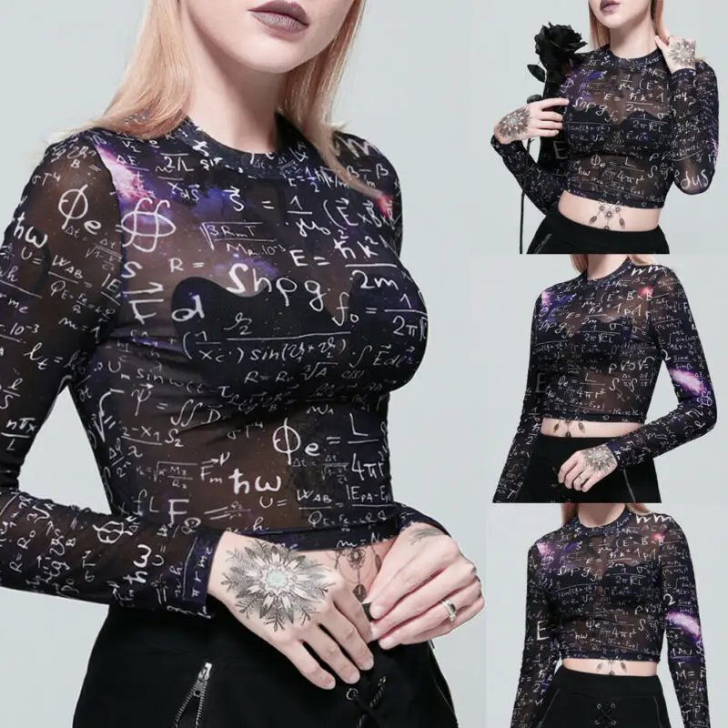 Discount Femmes Mode Sexy hauts Maille D'impression Perspective Manches Longues t-shirts hauts Lettre Imprim